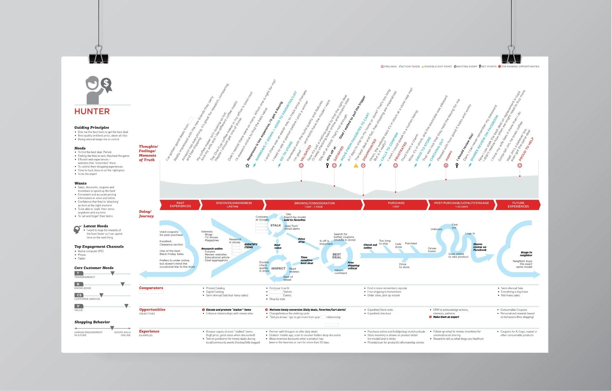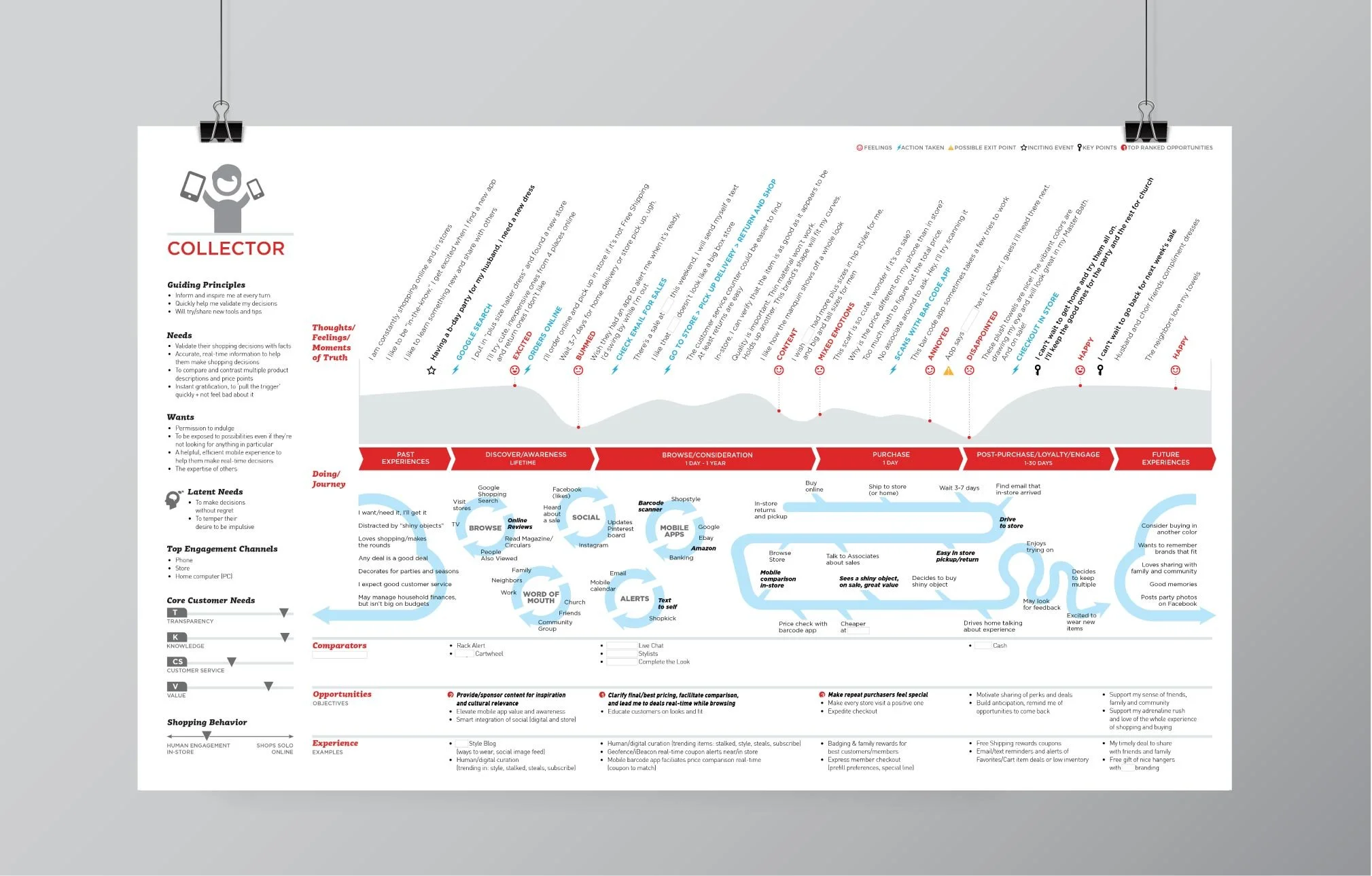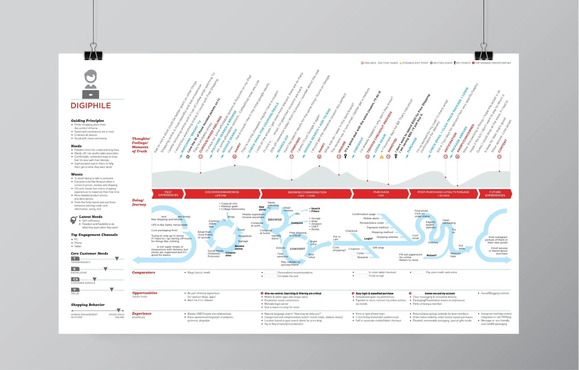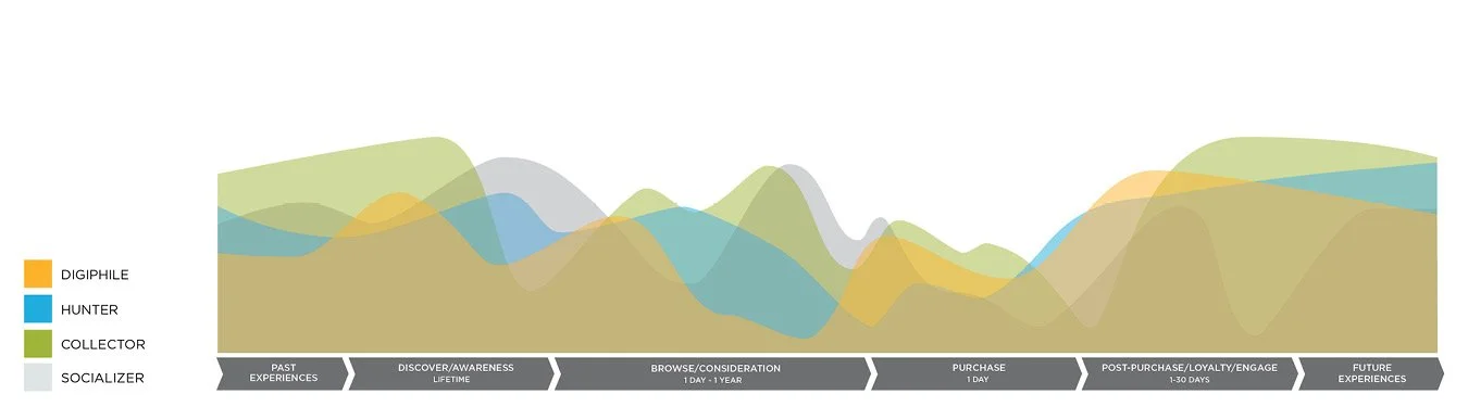 Journey maps reveal where and why people click, hesitate, or bail based on data analysis. I designed these visual tools to support the JCPenney marketing strategy so we could design experiences for customers where change matters most. We developed four archetypes based on shopper behavior.